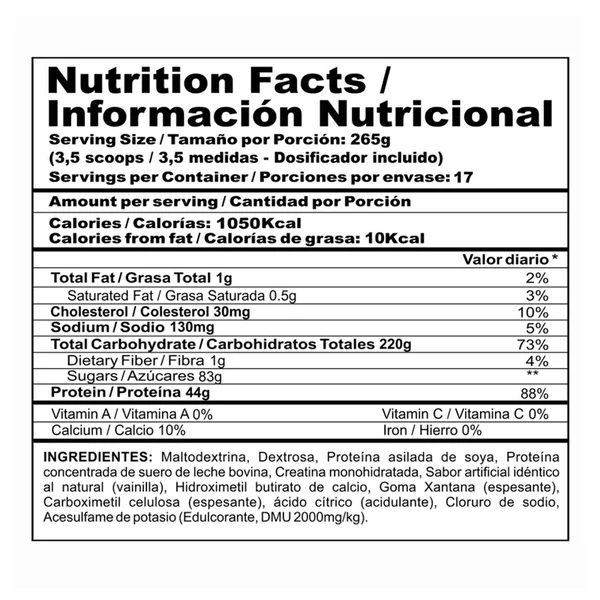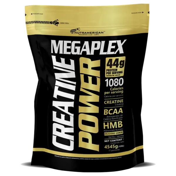 Megaplex Creatine Power es la mejor proteína de suero, hipercalórica que incluye en su innovadora fórmula 3000 mg de Creatina, HMB, BCAA, 44g de Proteína, 1050 calorías por porción y fuentes de Carbohidratos con diferentes velocidades de absorción.